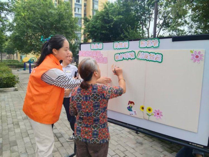 五一社区居民在“我承诺我做到”文明墙上签名。